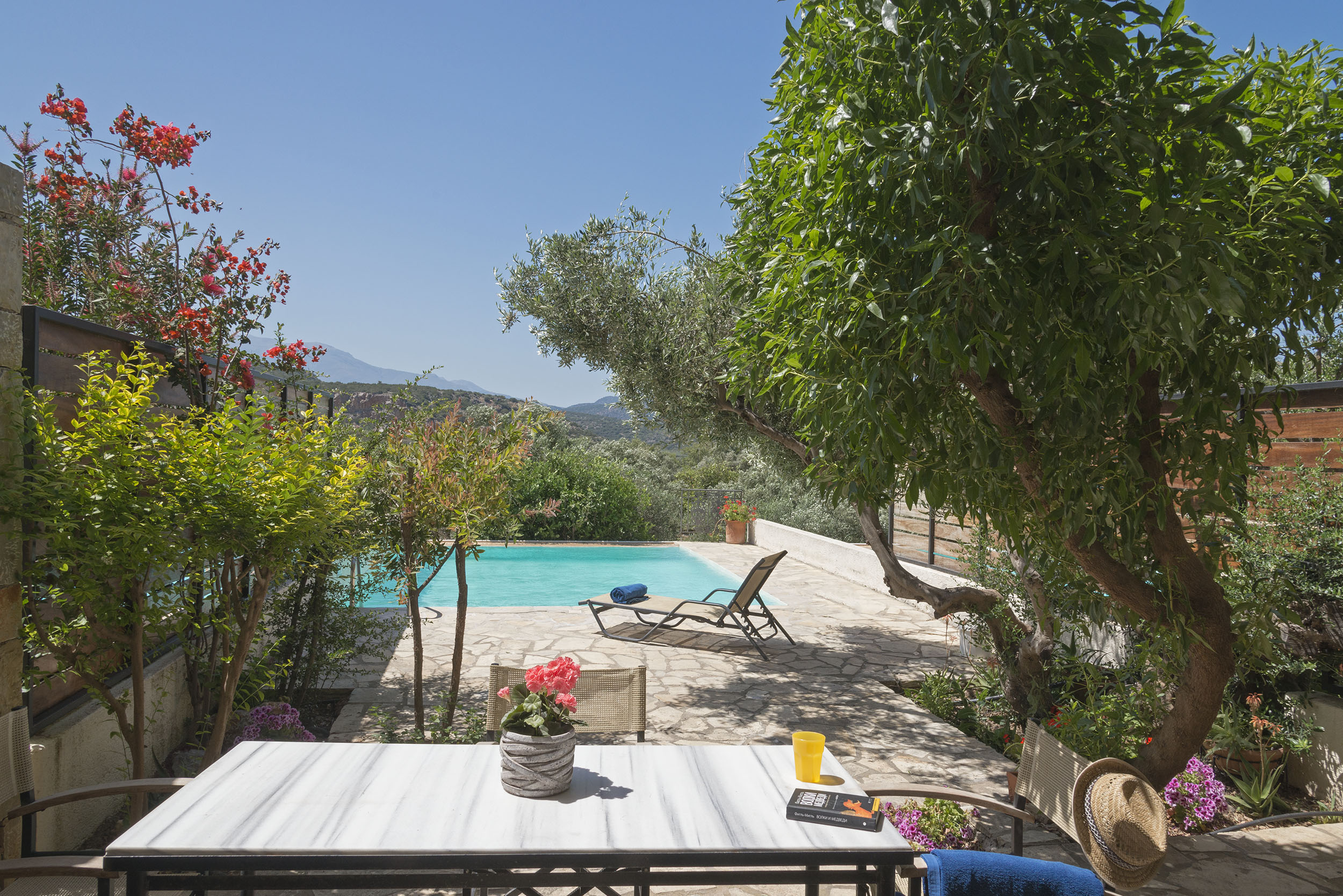 Η αυλή είναι υπερυψωμένη μέσα σε ένα πορτοκαλεώνα και ελαιώνα. Αυτός ο πράσινος τοίχος μαζί με την πισίνα δημιουργούν την αίσθηση ενός προστατευμένου εξωτικού περιβάλλοντος. Ο ήχος της πισίνας και της θάλασσας από μακριά συμπληρώνει την εμπειρία. Από το μπαλκόνι μπορεί κανείς να απολαύσει όλο το πράσινο χαλί που χύνεται στη θάλασσα.