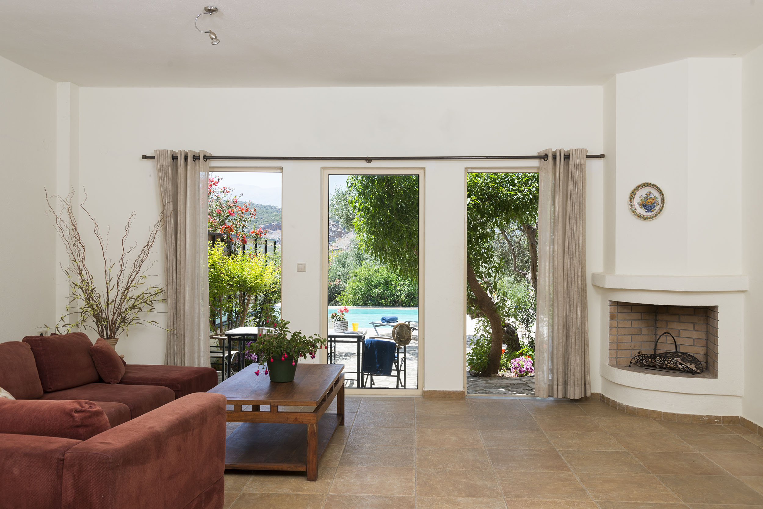 - Απέναντι από την πόρτα την εισόδου, μια μεγάλη τζαμαρία οδηγεί στην αυλή με την πισίνα.