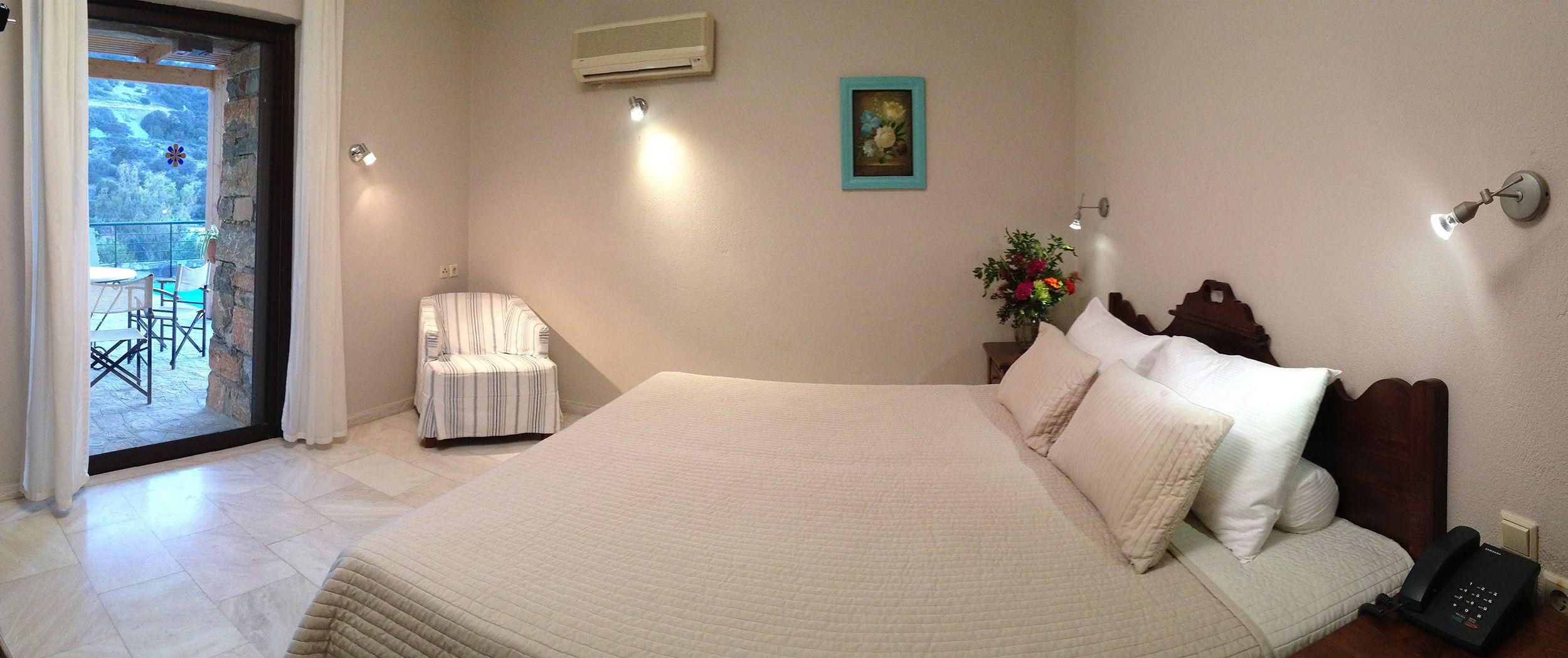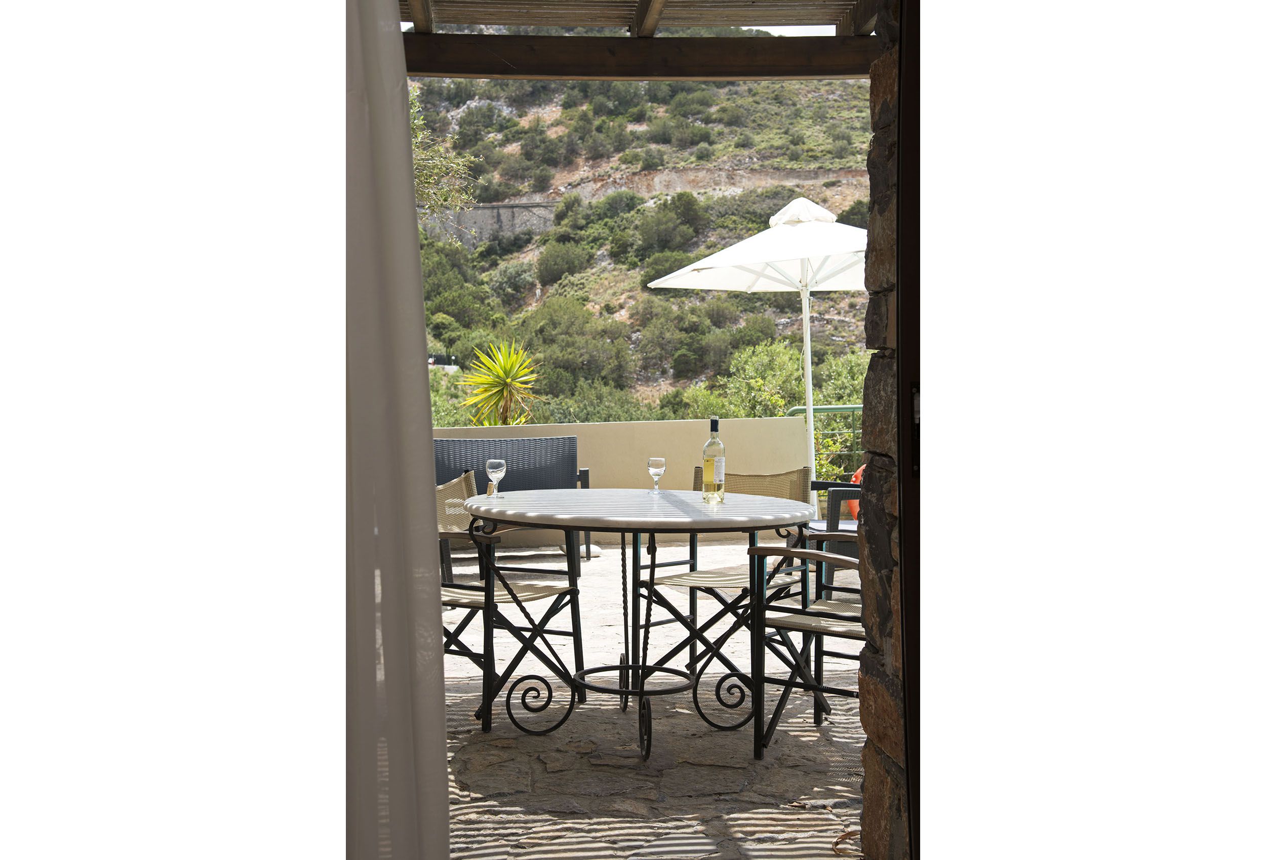 Η πλακόστρωτη αυλή προσφέρει θέα στο κόλπο και το απέναντι βουνό με την άγρια βλάστηση. Μπορεί κανείς σε μια ήσυχη ημέρα να απολαύσει το τραγούδι των τζιτζικιών τις πρωινές ώρες και την απαλή μελωδία των γρύλλων μετά το σούρουπο καθώς και τον ήχο από τα κύματα της θάλασσας.