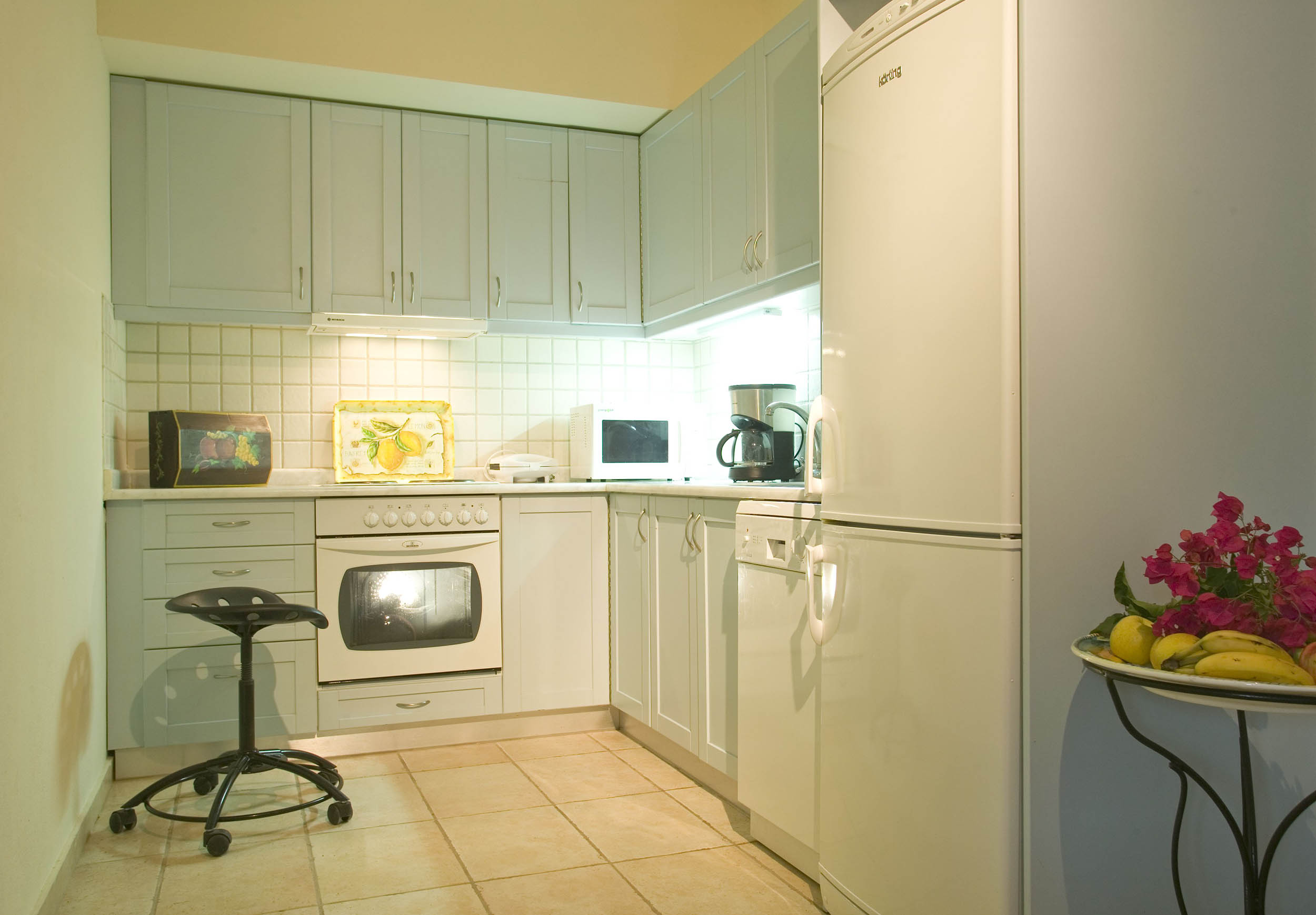 - Η κουζίνα διαθέτει: Βραστήρα, καφετιέρα, τοστιέρα ή φρυγανιέρα, φούρνο μικροκυμάτων, κουζίνα 4 εστιών, μεγάλο ψυγειοκαταψύκτη, πλυντήριο πιάτων, καθώς και τον απαραίτητο εξοπλισμό σε σκεύη κουζίνας.
