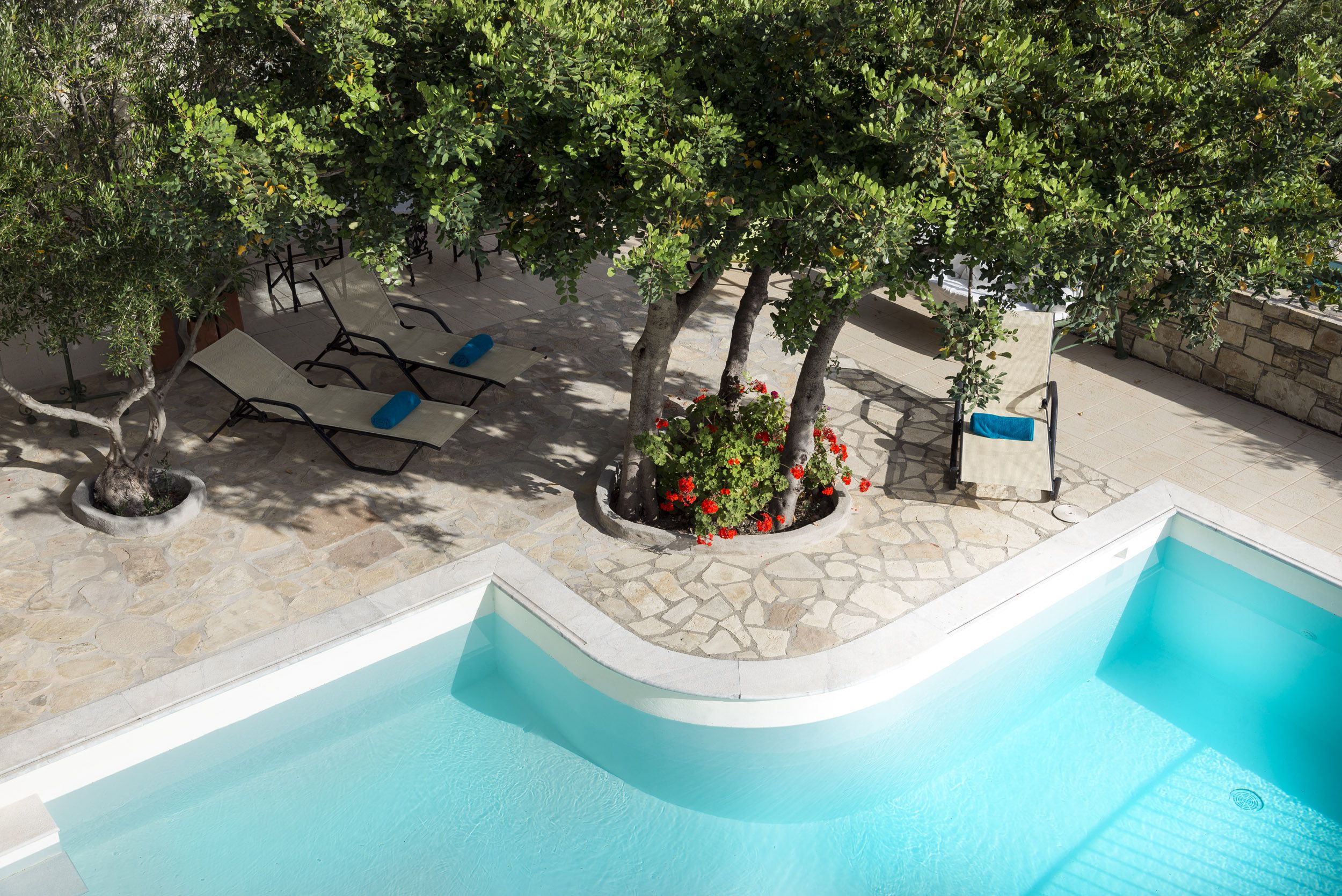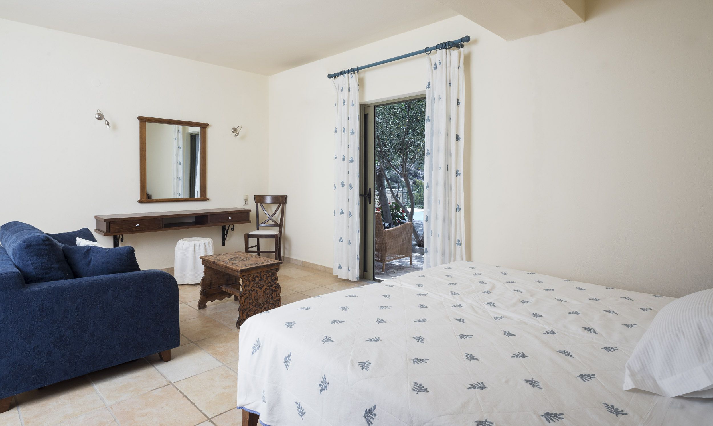 Η πλακόστρωτη αυλή, εν μέρει πλακόστρωτη και εν μένει με πλακάκια, στην οποία δεσπόζει μια μεγάλη χαρουπιά, προσφέρει απρόσκοπτη θέα στα απέναντι βουνά με την άγρια βλάστηση. Μπορεί κανείς να απολαύσει το τραγούδι των τζιτζικιών την ημέρα και η απαλή μελωδία των γρύλλων μετά το σούρουπο.