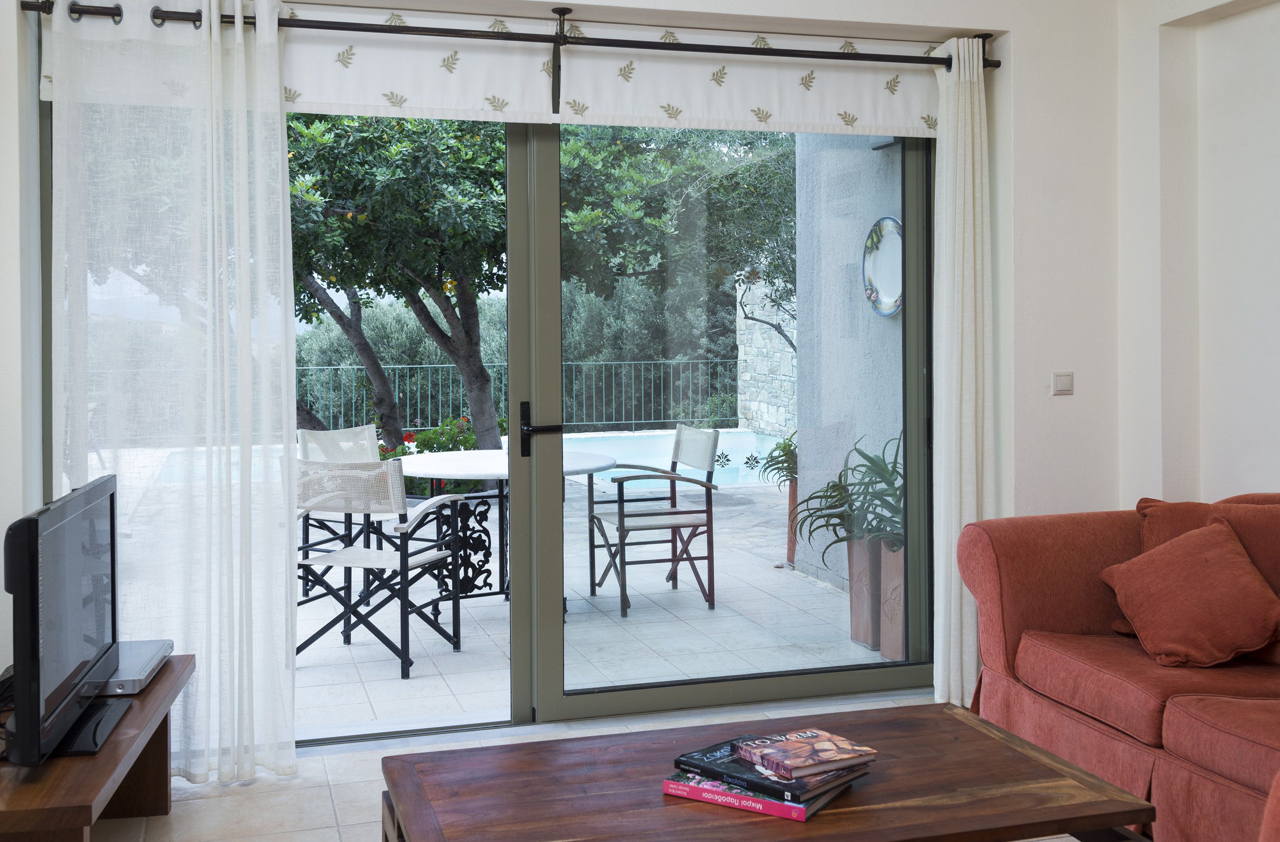 Μπροστά από την πόρτα που οδηγεί από το σαλόνι στην αυλή, βρίσκεται μια στεγανή ξύλινη πέργκολα, με ένα μεγάλο μαρμάρινο τραπέζι για φαγητό στην ύπαιθρο. Λίγο πιο πέρα υπάρχει σαλονάκι εξωτερικού χώρου για να χαλαρώσετε. Η αυλή είναι αρκετά ευρύχωρη ώστε να υπάρχει χώρος για τις ξαπλώστρες γύρω από την πισίνα. Ένα φορητό ΒΒQ είναι διαθέσιμο κατόπιν παραγγελίας.