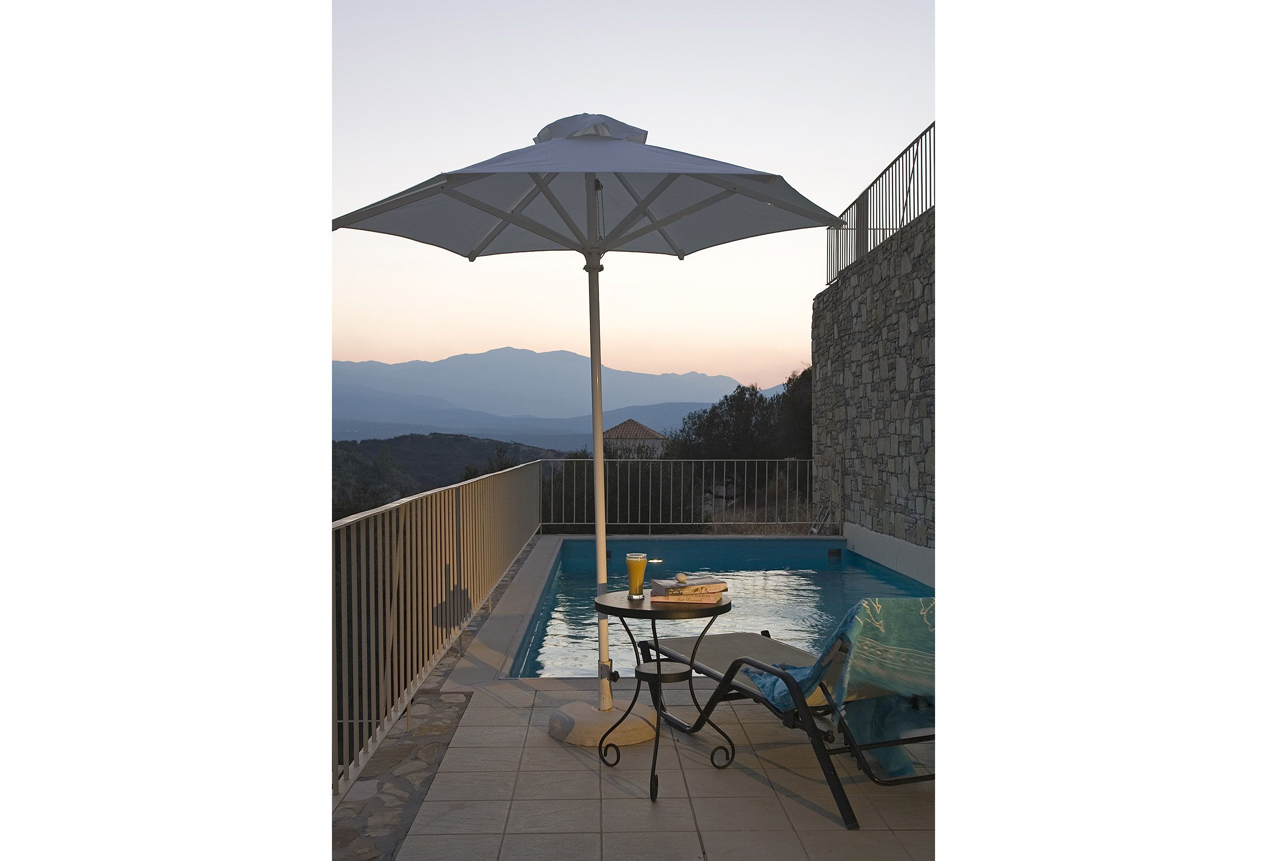 Η πλακόστρωτη αυλή, στρωμένη με πλακάκια, προσφέρει απρόσκοπτη θέα στα απέναντι βουνά με την άγρια βλάστηση. Μπορεί κανείς να απολαύσει το τραγούδι των τζιτζικιών την ημέρα και η απαλή μελωδία των γρύλλων μετά το σούρουπο.